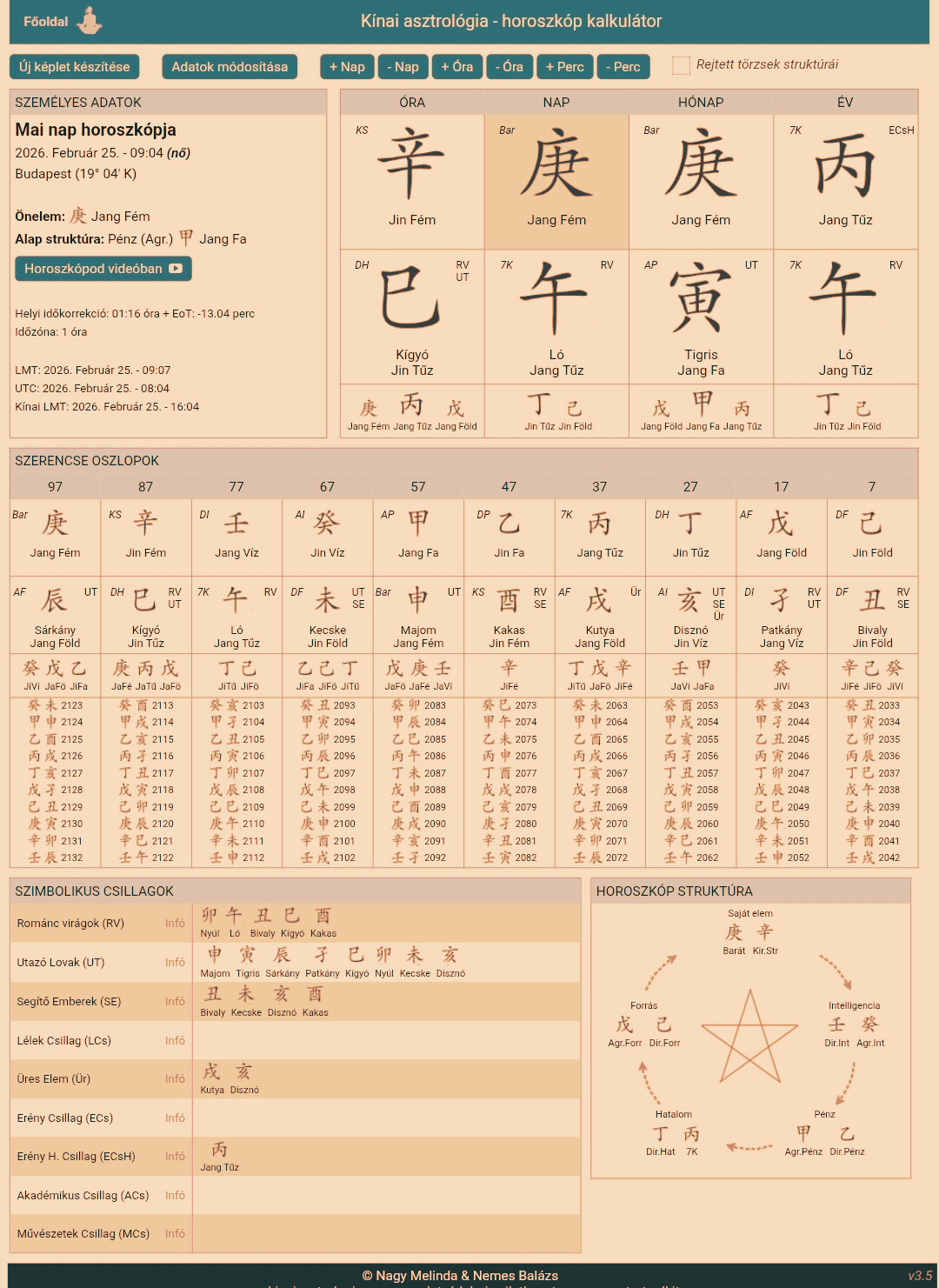 Születési adatok (év, hó, nap, óra, hely) alapján felállított kínai asztrológiai képlet megmutatja a születésedkor kapott feladatokat, energiákat.Azt, hogy ezt miként használod fel, Rajtad múlik!